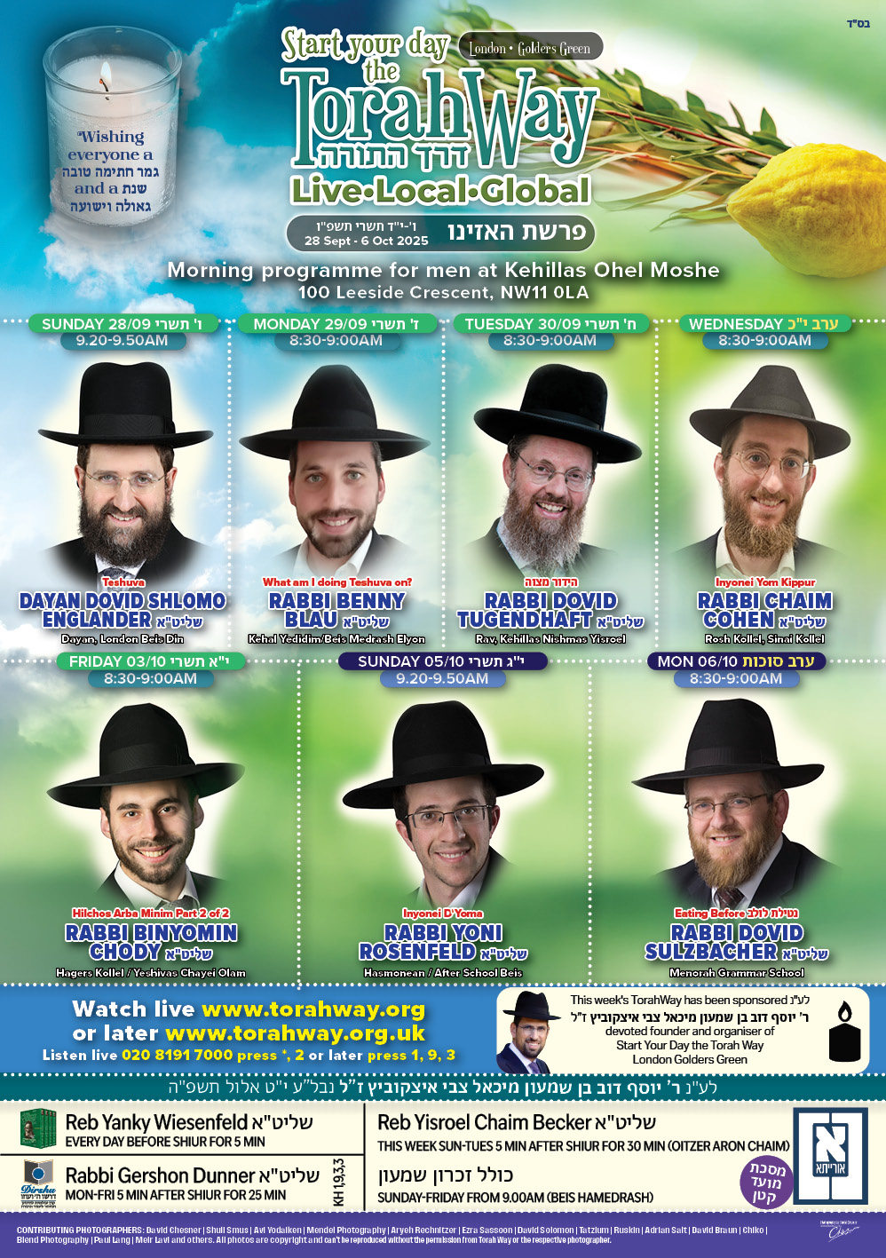 Sponsor a TorahWay week for £250 or sponsor a TorahWay shiur for £36. All donations are welcome and appreciated.